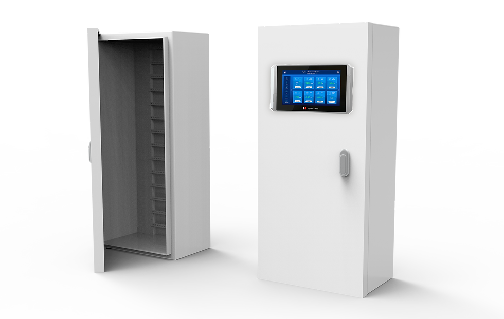 The Cooler Panels controller cabinet offers a comprehensive control solution, integrating the TrolMaster Hydro-X Pro and Carbon-X systems. The Hydro-X Pro features a 10” touchscreen and web-based software for flexible, customizable control, including backward compatibility with existing Hydro-X modules. The Carbon-X system ensures critical CO2 monitoring for up to 13 zones, with user-adjustable high and low-level alerts to maintain optimal indoor environments.